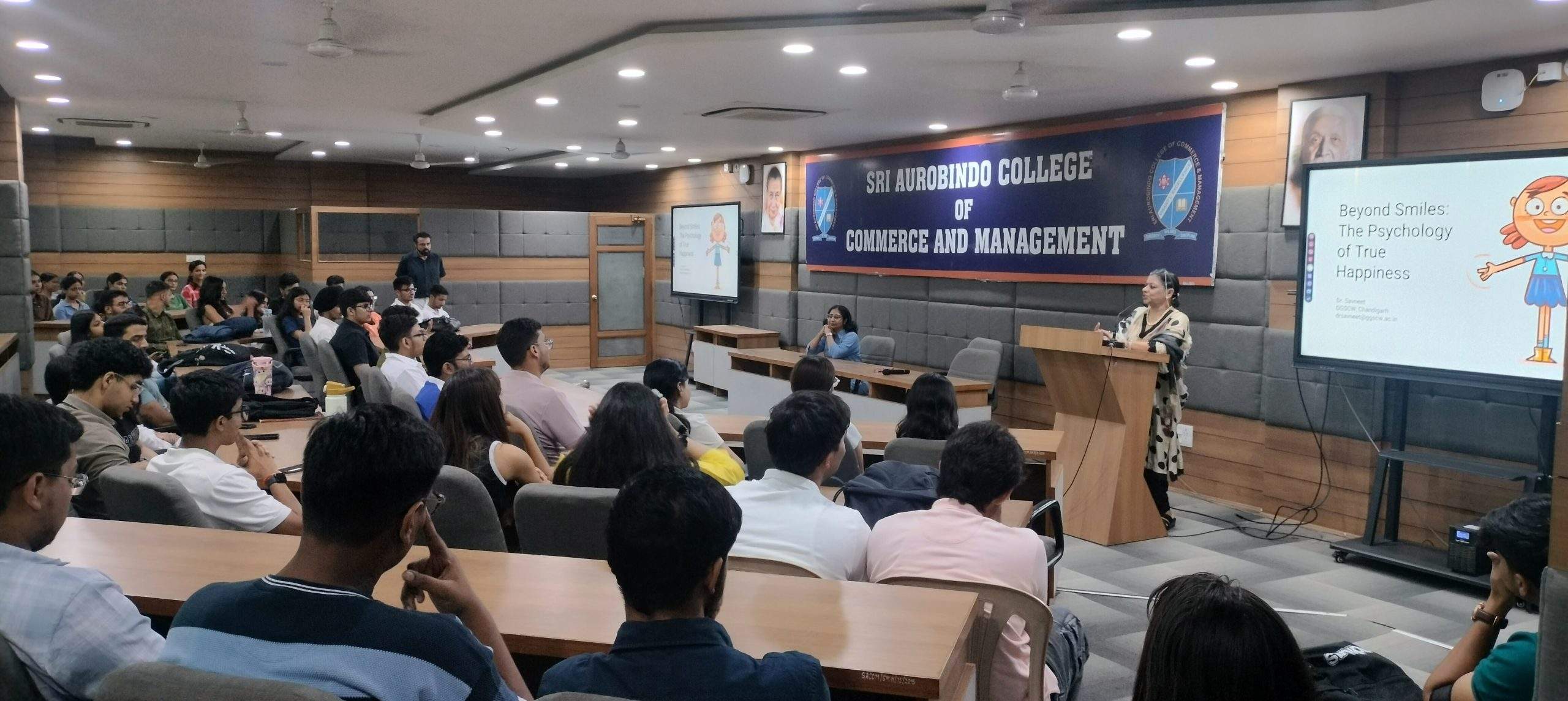 Sri Aurobindo College of Commerce and Management on August 28, 2025 organised a session on the topic ‘Beyond Smiles: The Psychology of True Happiness’ under ‘Shape the Mind Programme.’ The resource person for the expert talk was none other than Dr. Savneet, Head, Department of Psychology, Guru Gobind Singh College for Women, Chandigarh. Dr. Puja Jain introduced the distinguished speaker in her eloquent manner. Then Dr. Savneet started the session in extremely exciting and lively style and greatly dwelt upon the power and importance of happiness in modern times. In her highly educative, informative and well packed lecture, she focused on the fact that there is a sea difference between temporary and sustainable happiness. She said getting a thing that one desires may bring transitory joy, but the real question is—will that feeling of joy last permanently? Perhaps not. The science behind true happiness, she said, can be biological, psychological and sociological. At times we hyphenate money with happiness. It is a wrong hyphenation. Money may bring short comfort but not the everlasting one. She also talked about the practices that foster true happiness. She further stated that one should not wait for the real happiness to embrace you, rather you should be the one to pocket it as and when it comes. She most beautifully stated that humans are always better than the gadgets because gadgets do not possess any psychological acumen, whereas humans do. The students were all acclaim for not only the brilliant talk but also for the brilliance of Dr. Savneet. Mr. Sahil Ghai expressed gratitude to the luminous speaker through vote of thanks. Mr. Vinay Dawar lent a great hand in making the session a success.
