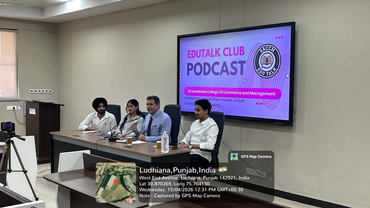 The EduTalk Club of Sri Aurobindo College of Commerce and Management organized an insightful Podcast Session on “Geopolitics” on 15-04-2026 from 11:00 AM to 1:00 PM in the Seminar Hall. The session aimed to provide students with a deeper understanding of global political dynamics, international relations, and current geopolitical developments shaping the world today. The podcast format created an engaging and intellectually stimulating environment where ideas were exchanged thoughtfully.