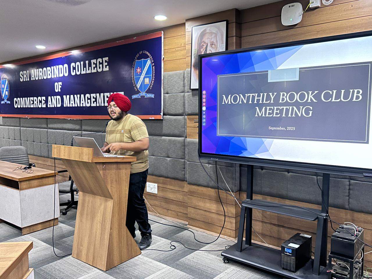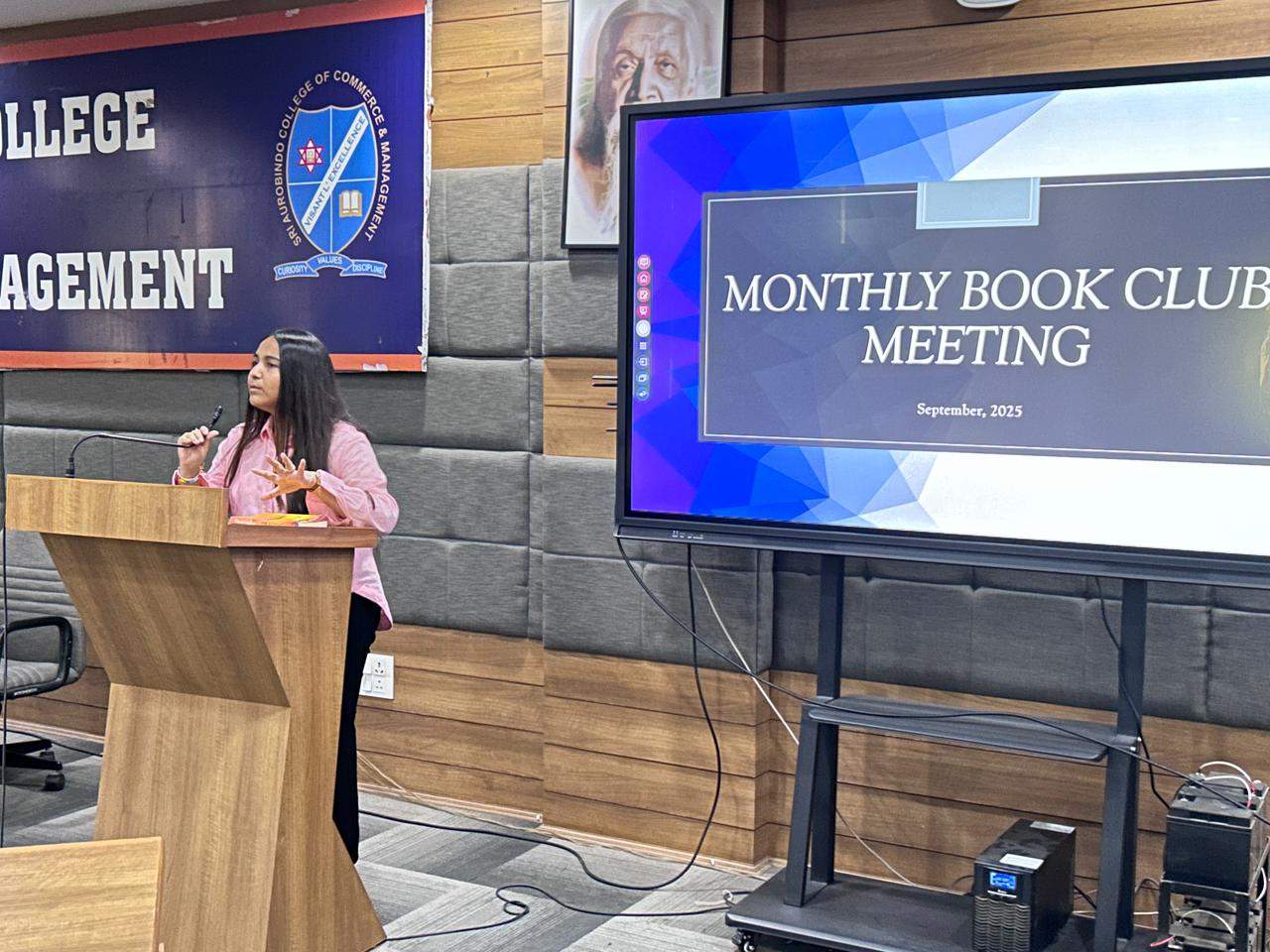 The monthly meeting of the Book Club of Sri Aurobindo College of Commerce and Management was held in September 2025 with enthusiastic participation from students across different classes. The session began with a brief appraisal of the forthcoming activities planned for the semester. Students were informed about upcoming reading challenges, thematic book discussions, and interactive sessions that aim to further strengthen the culture of reading on campus. It was also decided that one common book will be given to all members, for which they will submit a written book review. The best review will be selected and published on the college website, thereby motivating students to engage deeply with the text and refine their critical thinking and writing skills. Several students shared their learning experiences gained through consistent reading practices. They highlighted how regular engagement with diverse books has not only enhanced their vocabulary and comprehension but also broadened their perspective on various social, cultural, and intellectual issues. 6 Members presented the books they had recently completed, giving concise summaries and personal reflections. In addition, students suggested several creative activities peer-to-peer recommendation sessions, and inviting guest authors for interactive talks.