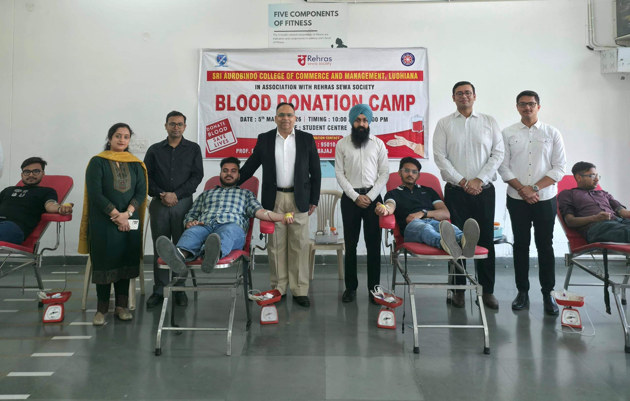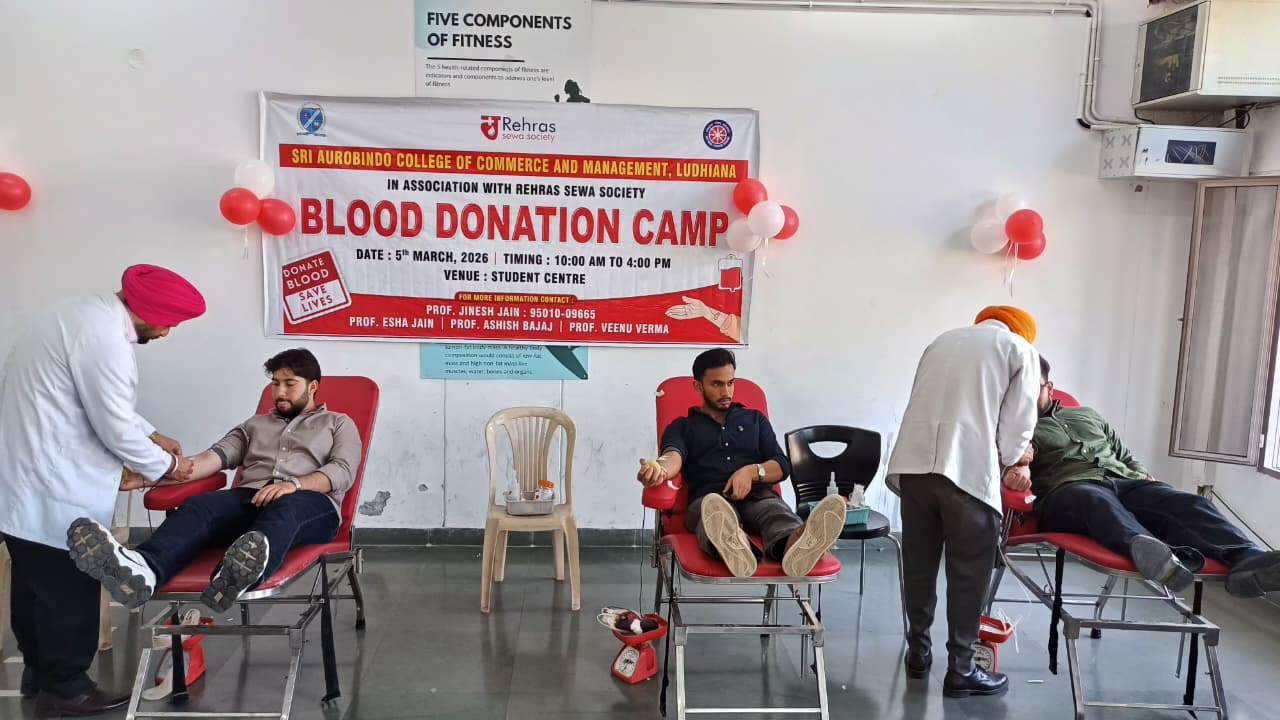 The N.S.S. Unit of Sri Aurobindo College of Commerce and Management in collaboration with REHRAS SEWA SOCIETY, organised its Annual Blood Donation Camp, on March 5, 2026. A dedicated team of doctors and lab technicians from a prominent hospital of Ludhiana visited the college premises to oversee the event. During the camp, a remarkable total of 66 units of blood were graciously donated by students of the college.