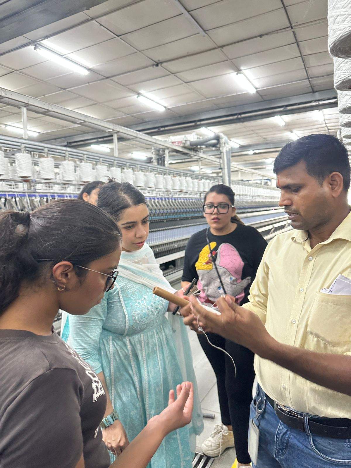 Students gained a clear understanding of the continuous production process, including the sourcing of raw materials, their processing, and conversion into fine yarn for further supply. They also observed the dyeing and printing processes, along with the final packaging of the finished product.