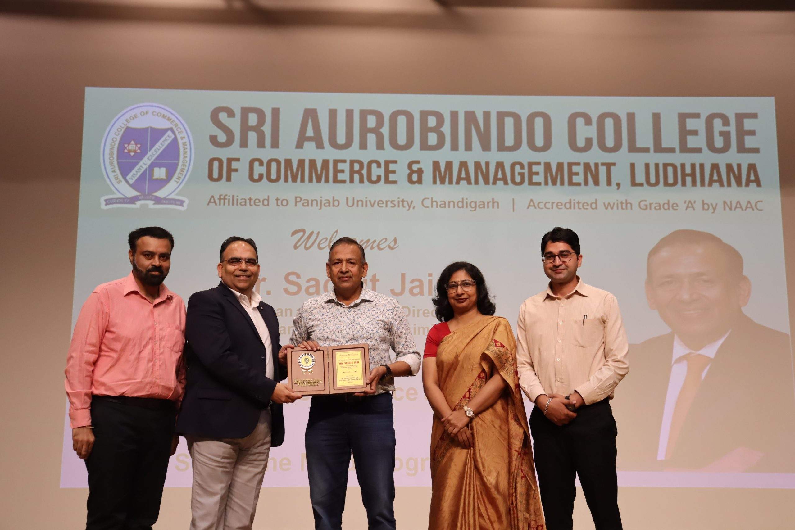 Sri Aurobindo College of Commerce and Management on October 15, 2025, organised a session on the topic ‘Leading with Persistence and Vision’ under ‘Shape the Mind Programme.’ The resource person for the expert talk was none other than the celebrated speaker and a business magnate, Mr. Sachit Jain, Chairman and Managing Director, Vardhman Special Steels Limited, Ludhiana. Principal, Prof. (Dr.) Vishal Kumar, extended a formal welcome to the speaker, and expressed the wish that more such meaningful sessions be organised for the students and faculty. He acquainted the gathering with the brilliance and eloquence of Mr. Sachit. Dr. Puja Jain introduced the distinguished scholarly Mr. Sachit Jain with her felicitating words. Then Mr. Jain started the session in his scholastic and lively style and greatly dwelt upon the power of youth in the modern times. He animated his lecture with pragmatic examples from day-to-day experiences. In his highly educative, informative and well packed lecture, he focused on the fact that the young students should cultivate in themselves the spirit of leadership by taking brave decisions. He said that you are the master of your fate, and you are the captain of your soul. He highlighted the importance of persistence, and vision, inspiring students to pursue their dreams with passion, determination and purpose. He advised the students that in order to be a good leader, one should not always toe the trodden path; rather be a good organiser and impact the fellow beings with critical faculties. He said, the greatest glory in living lies not in never falling, but in rising every time we fall. He further said that you will face many defeats in life but never let yourself be defeated. He took into his ambit examples from his visits to Japan and other countries. In order to be a forerunner, he exhorted the students to come out of their comfort zones. He further stated one should not wait for the change to happen, rather the change should always start from oneself. He narrated his own trekking experience and told the students to follow their heart and live life king size. He also said money can buy most of the things but not all the things. Mental health is the key to good life, and if you are happy only then you can be judicious in your decisions. He gave ample of examples from his college life. He said, live healthy and retire happily. The session was interactive in nature. Students posed a number of questions to the resource person, and every question was answered with superlative brilliance. The students were all acclaim for the brilliance of Mr. Sachit Jain. Mr. Sahil Ghai expressed his gratitude to the luminous speaker through vote of thanks. Mr. Vinay Dawar lent a great hand in making the session a success.